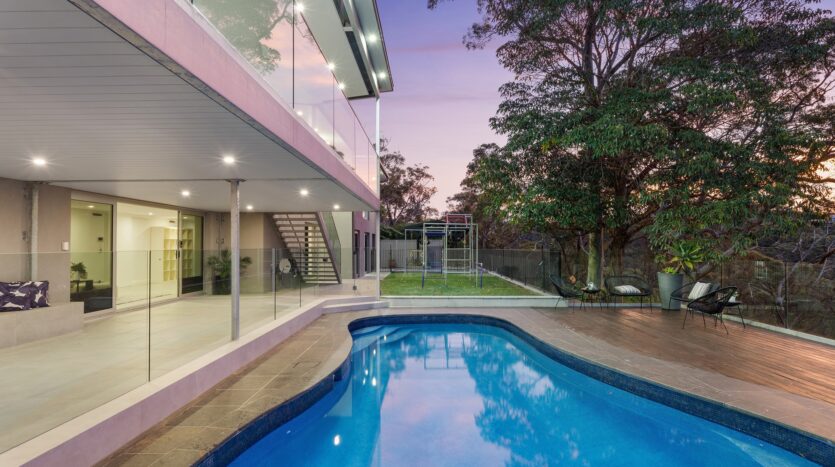 – The lower-level living and media rooms are accessible either from the terrace or via a stunning staircase framed with glass balustrades. Rich timber stairs, highlighted by LED lighting, adding a touch of elegance and drama to the space.