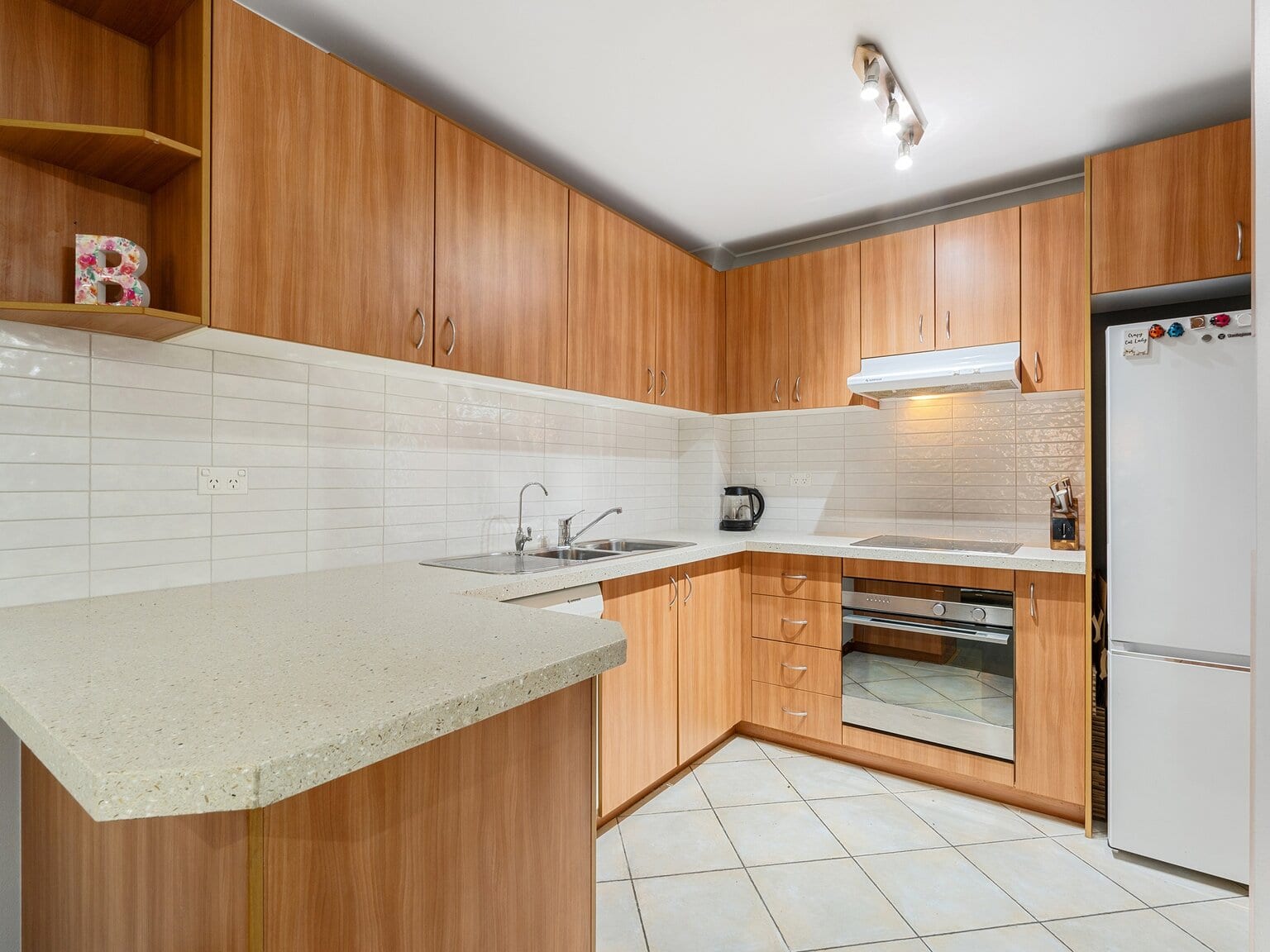 – The fresh kitchen offers generous bench space and abundant cabinetry, enhanced by a stylish subway tile splash back and a dedicated microwave cabinet for extra storage.